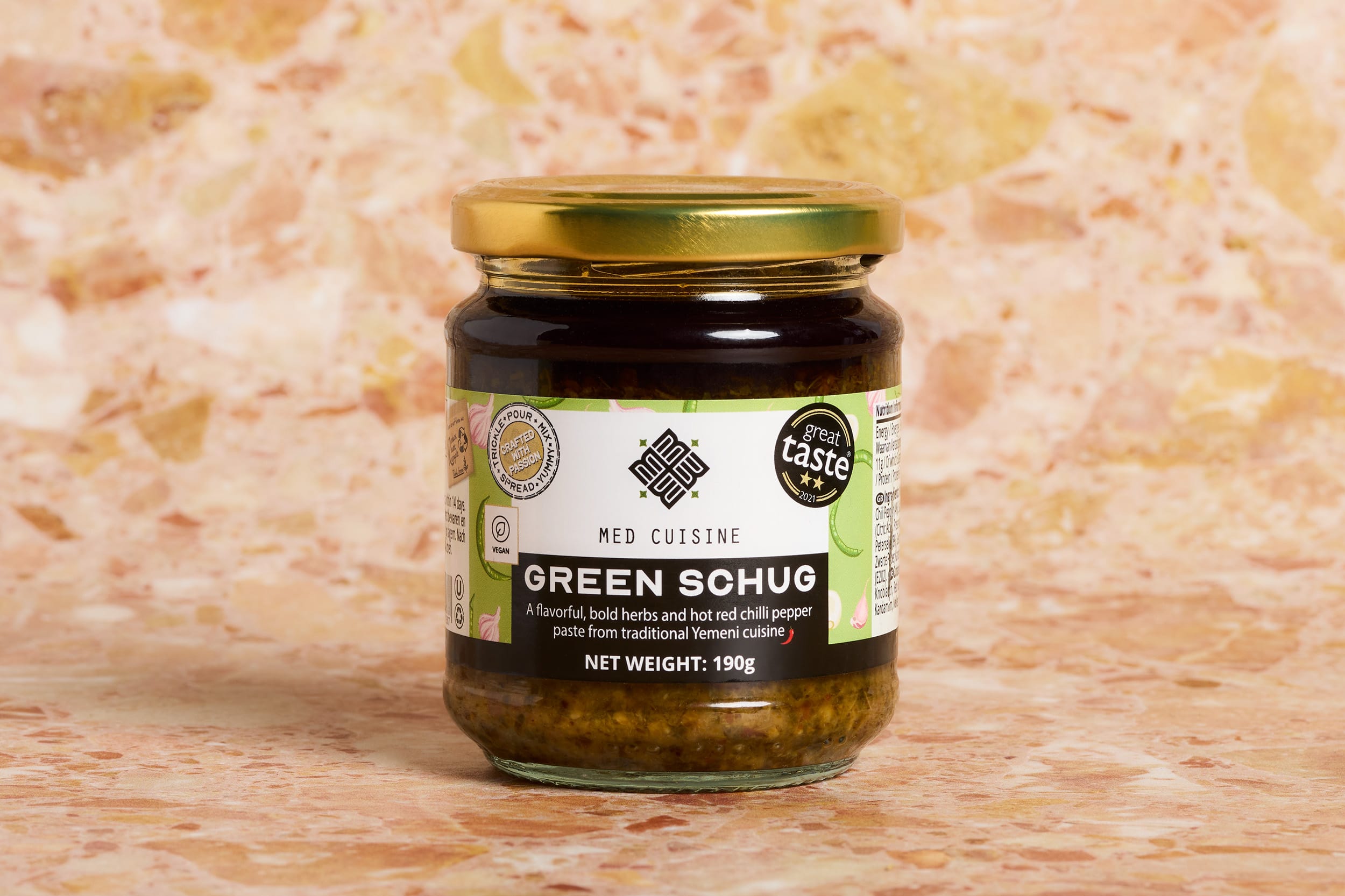 Green Schug is a zesty and herbaceous hot sauce or condiment. Made with ingredients like green chilli peppers, garlic, coriander and various spices, it packs a punch of heat and fresh flavours.